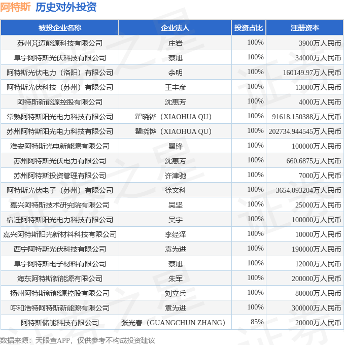 本站消息,根据天眼查APP显示,阿特斯(688472.SH)新增一起对外投资事件,被投资公司为苏州芃迈能源科技有限公司,法定代表人庄岩K8金融,投资占比为100%。该公司从事科技推广和应用服务业K8金融,注册资本为3900万人民币。目前,阿特斯共存在对外投资27项,投资占比前20的项目见下表: