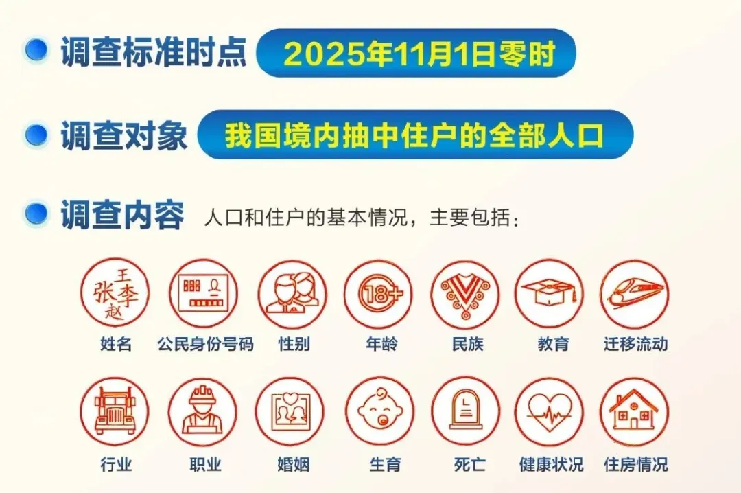 国务院决定于2025年11月1日进行全国1%人口抽样调查。麻涌镇有57个调查小区被抽中,在11月1日至12月10日期间,调查指导员和调查员统一身穿马甲和佩戴工作证,到抽中的调查小区进行摸底和登记工作,如被抽中,请您积极配合。